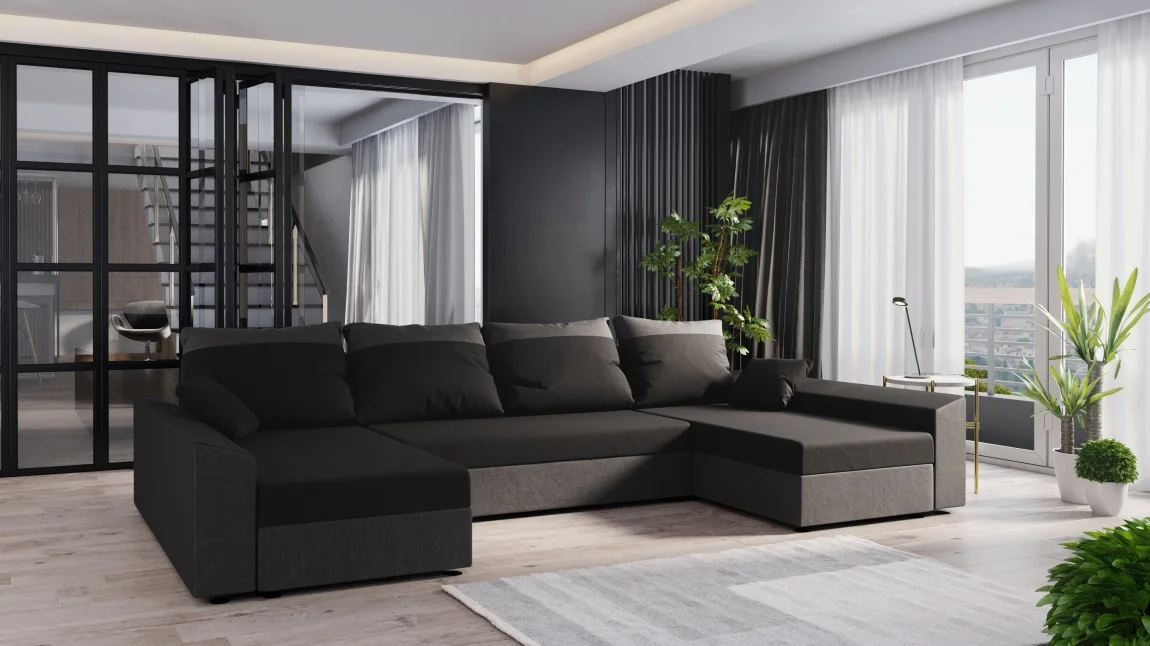 Rozkládací rohová sedačka ve tvaru U kombinuje pohodlí s praktickou variabilitou a poskytuje komfortní posezení pro větší rodinu. Potahové látky Sawana 14 (černá) a Sawana 05 (tmavě šedá) umožňují zvolit vzhled podle interiéru.