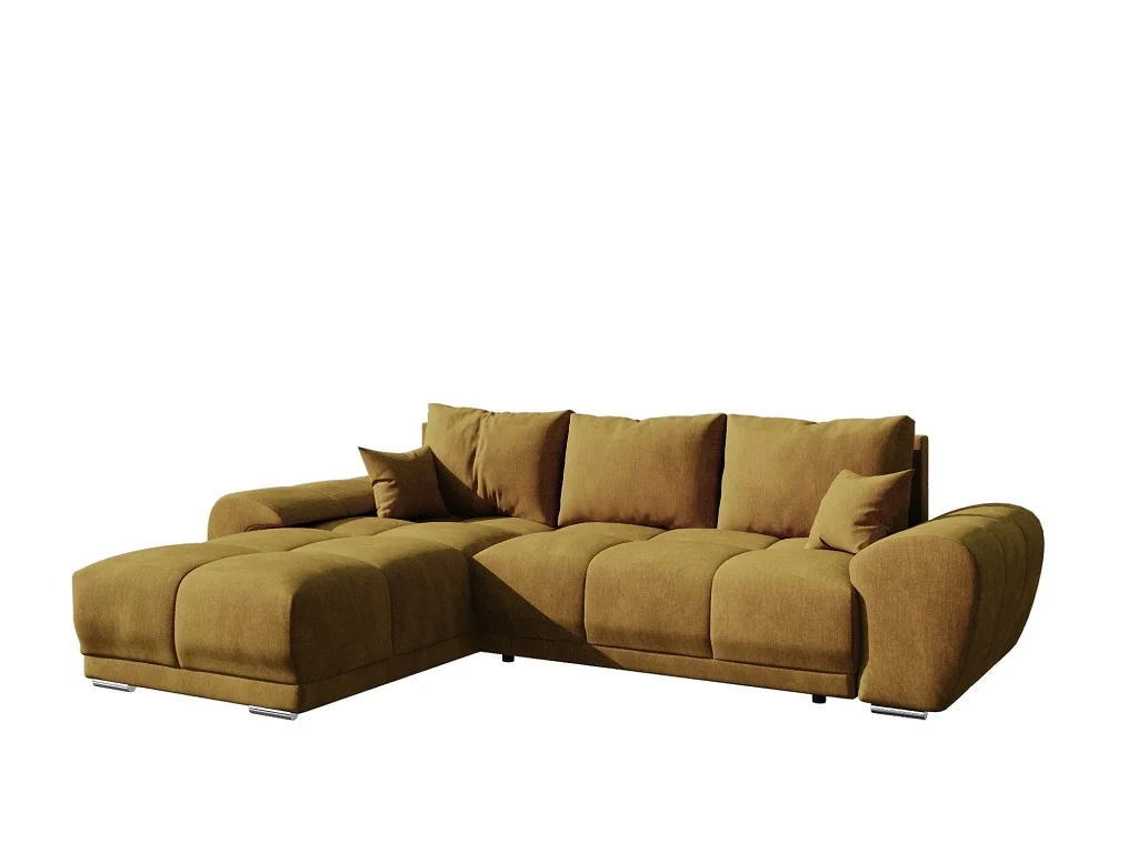 Rohová sedačka CERDAGNE je modulární a dá se smontovat s rohem na levou i pravou stranu podle dispozice prostoru. Součástí jsou tři větší a dva menší polštáře a úložný prostor, který usnadní ukládání postelových potřeb. Sedačka je celé čalouněná a vhodná do prostornějších interiérů; sedák je prošívaný pro elegantní vzhled. Rozkládací mechanismus DL umožňuje pohodlné rozložení na lůžko o rozměru 220 x 130 cm, zatímco celkové rozměry sestavy činí 294 x 85 x 184 cm. Potahová látka Monolith 48 v syté žluté barvě dodává interiéru svěží akcent a působí moderně. Sedačka kombinuje vlnitou pružinu s pěnou T30 pro komfortní sezení. Nohy jsou chromované kovové a dodáváno v demontu. Poznámka: ilustrativní fotografie zobrazují jiný odstín barvy.