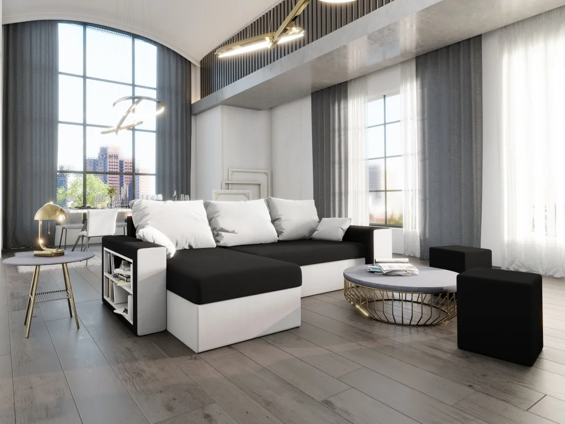 Univerzální rozkládací rohová sedačka CHAMPNELLA kombinuje pohodlí s praktickými prvky, jako je vestavěná knihovna a dva taburety. Roh lze snadno otočit na pravé i levé provedení pro optimální uspořádání v prostoru.