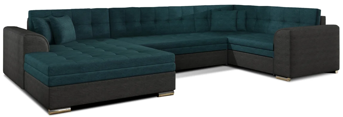 Rozkládací rohová sedačka ve tvaru U s levým provedením poskytuje pohodlí pro posezení a nabízí prostorné lůžko pro hosty. Potahová látka kombinuje tyrkysovou Dora 85 a tmavě šedou Dora 96.