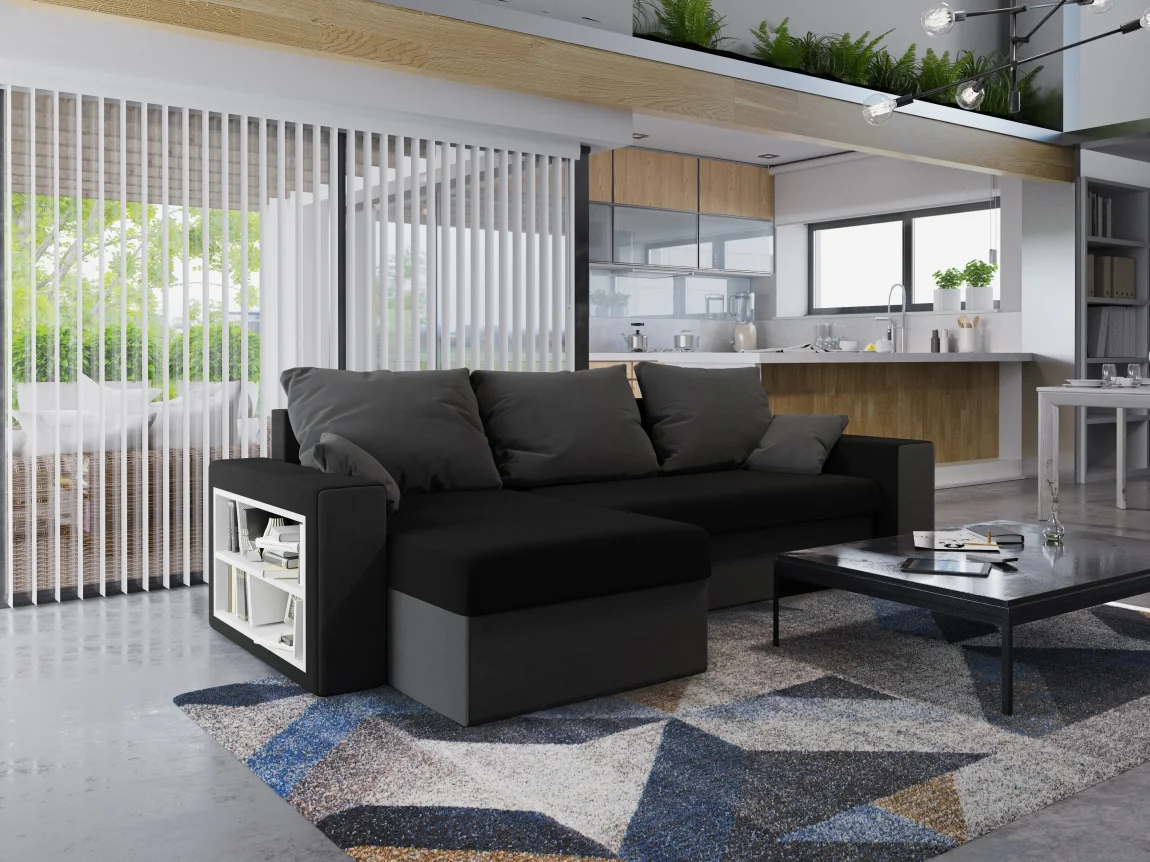 Rohová sedačka HALSTED s knihovnou (černá/šedá) Sedací soupravy