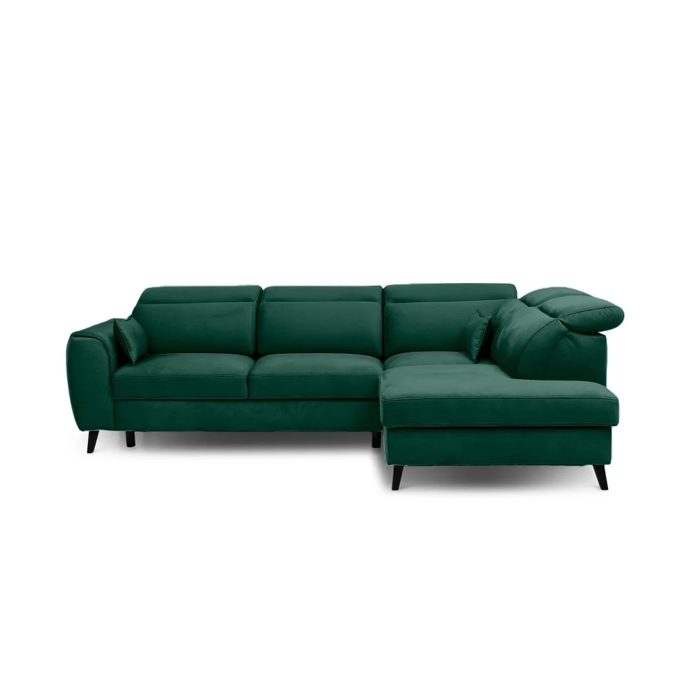 Rozkládací rohová sedačka v pravém provedení s potahem v zelené látce odstínu nube 35. Zadní část sedačky je potažena stejně, takže ji lze postavit i bez volného zadního prostoru. Rozměry: 255 × 201 × 100 cm (výška bez polštářů 83 cm, výška sedu 45 cm).