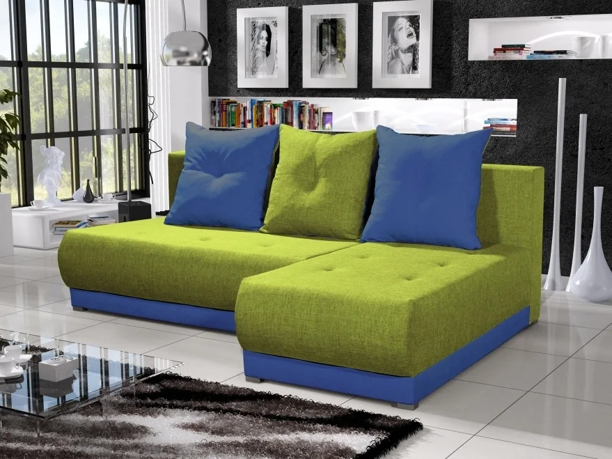 Rohová rozkládací sedačka KAISON 16 v kombinaci zelené a modré látky Sawana nabízí komfortní posezení i prostorné spaní. Potahy Sawana 35 (zelená) a Sawana 80 (modrá) slibují příjemný dotyk, odolnost a snadnou údržbu.