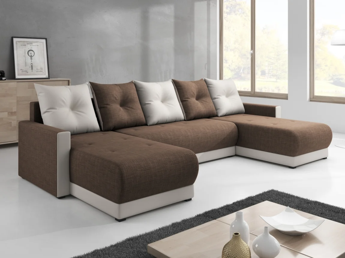 Rozkládací rohová sedačka ve tvaru U kombinuje pohodlí s praktičností pro každý obývací prostor. Potahy nabízíme ve dvou provedeních: Sawana 25 světlá hnědá a Sawana 01 krémová. Ilustrační foto rozložené sedačky ukazuje jinou barvu; skutečná barva může mírně lišit.