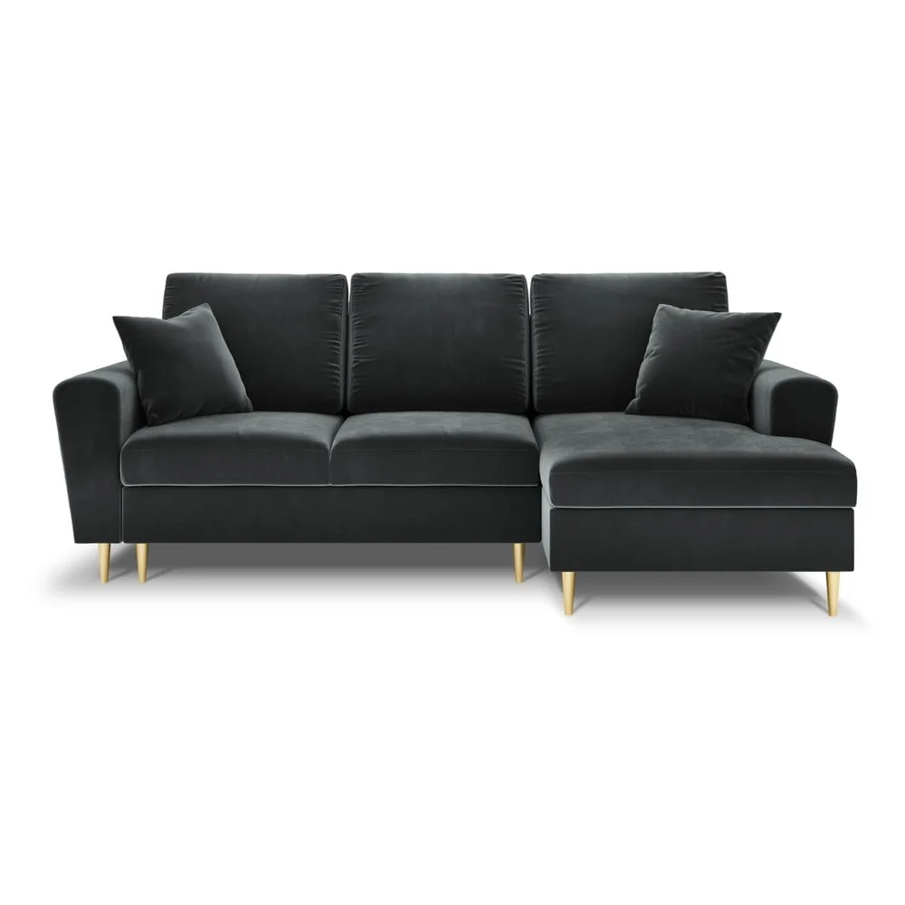 Elegantní sametová rohová pohovka Kyoto v tmavě šedé barvě je ideální volbou pro moderní interiéry. Díky své rozkládací konstrukci poskytuje pohodlné spaní pro hosty, zatímco integrovaný úložný prostor umožňuje efektivní skladování polštářů, deček nebo jiných drobností.