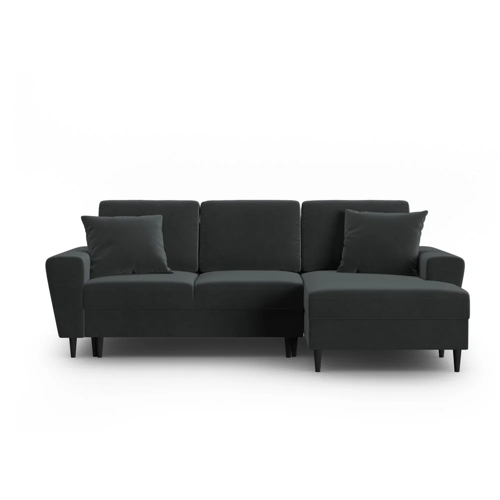 Moderní sametová rohová pohovka Kyoto v elegantní tmavě šedé barvě je ideálním doplňkem každého obýváku. Díky svému rozkládacímu mechanismu nabízí pohodlné přespání, zatímco integrovaný úložný prostor umožňuje efektivní skladování polštářů, dek nebo jiných drobností.