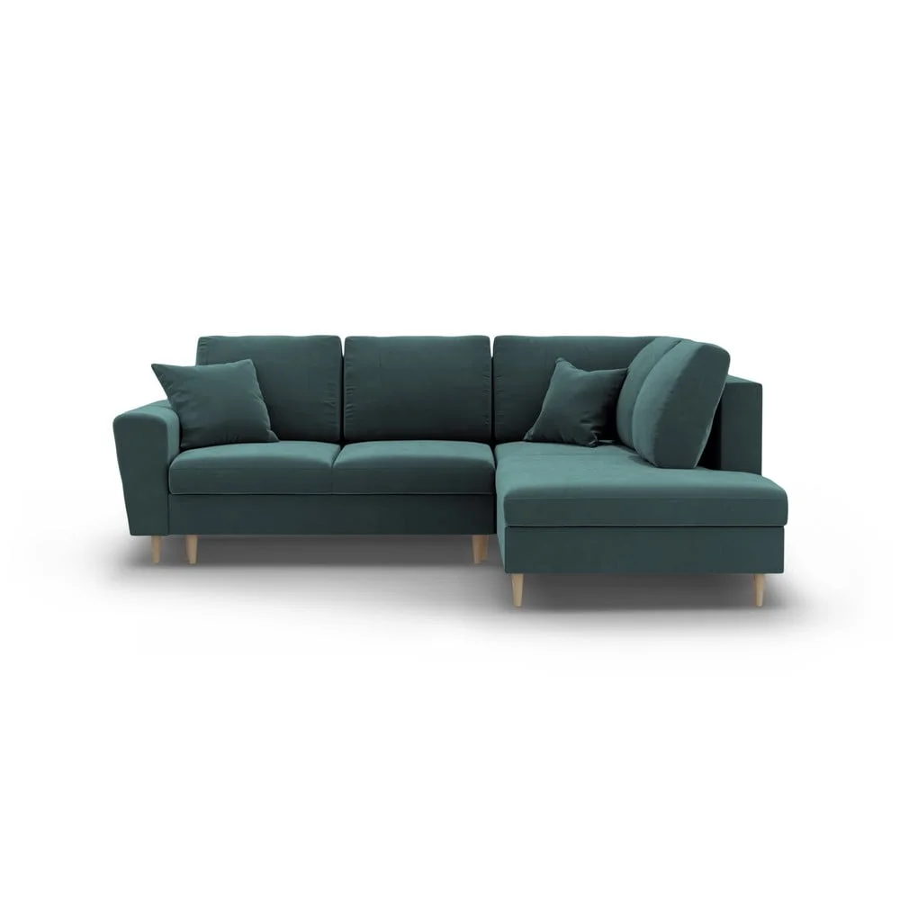 Elegantní sametová rohová pohovka Kyoto v moderní petrolejové barvě je ideálním řešením pro stylový a praktický obývací pokoj. Díky svému rozkládacímu mechanismu nabízí pohodlné přespání a zároveň obsahuje prostorný úložný prostor pro polštáře, deky či jiné věci.