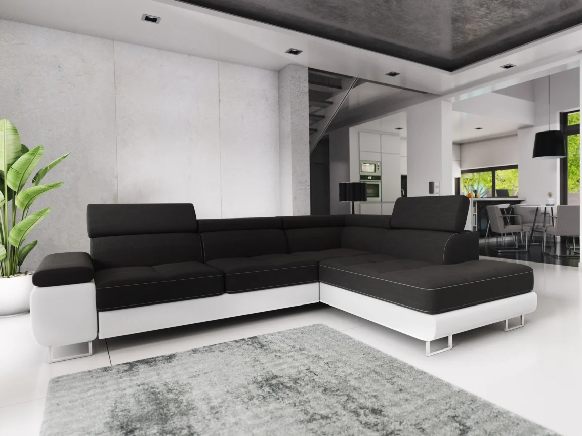 Rozkládací rohová sedačka LAING L v pravé orientaci kombinuje moderní design s praktickými funkcemi. Potahová kombinace zahrnuje černou látku Sawana 14 a bílou ekokůži Dolaro 511, která vytváří odolný a snadno udržovatelný povrch.