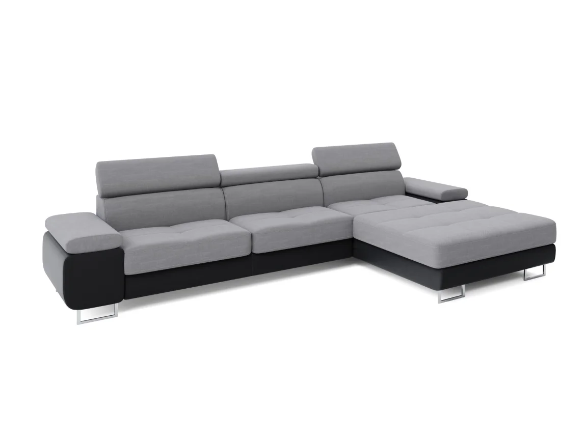 Rozkládací rohová sedačka s pravou orientací spojuje komfort s praktičností pro váš obývací prostor. Potahové materiály tvoří kombinace látky Sawana 21 v světlém odstínu šedé a Dolaro 8 v černé ekokůži, které vypadají moderně a zároveň usnadňují údržbu.