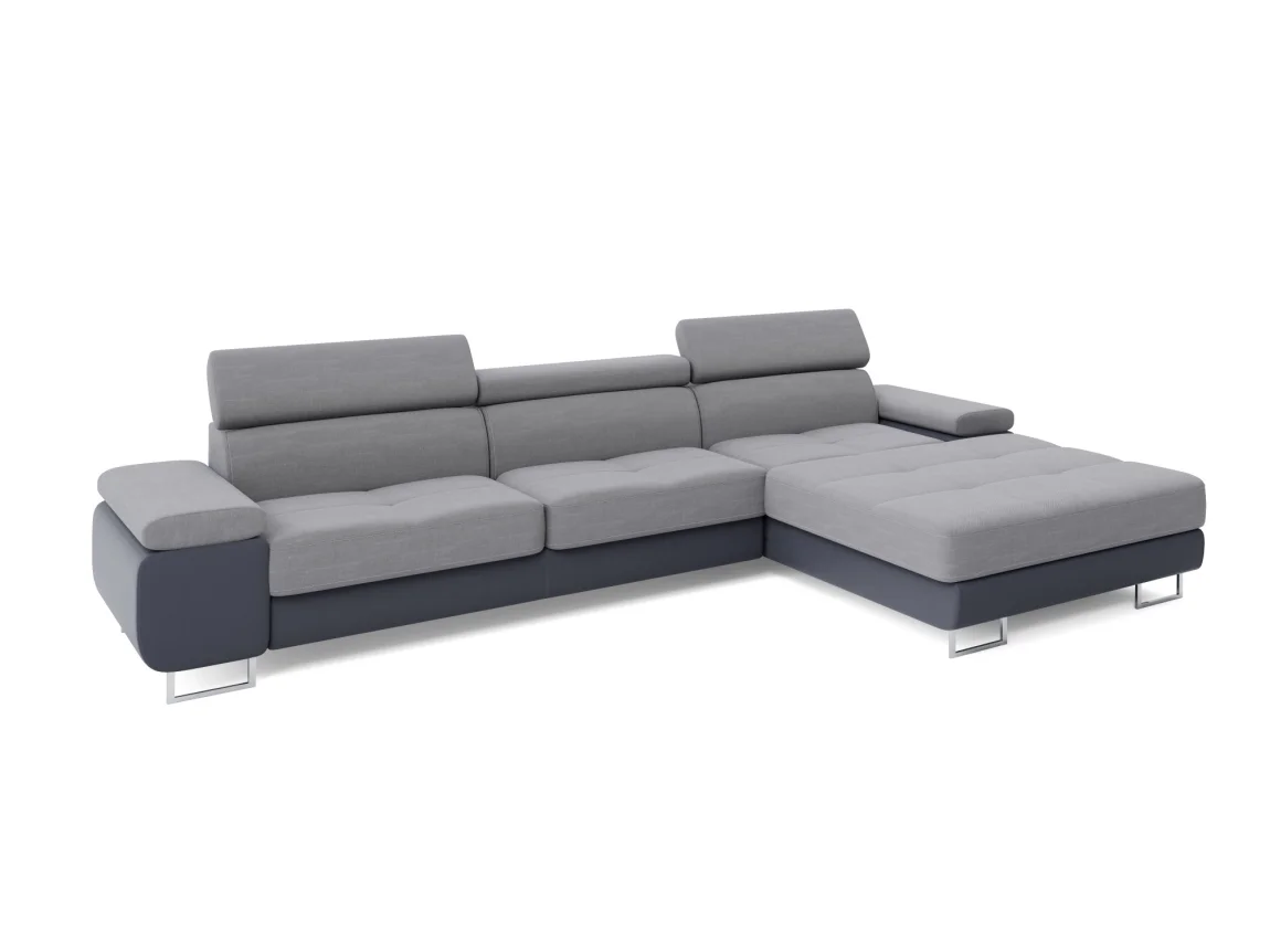 Rohová sedačka LAING MINI v pravé orientaci kombinuje pohodlí s praktickou funkcí. Pro potahové varianty lze zvolit světlou látku Sawana 21 nebo šedou ekokůži Dolaro 4, díky čemuž snadno doladíte vzhled svého interiéru.