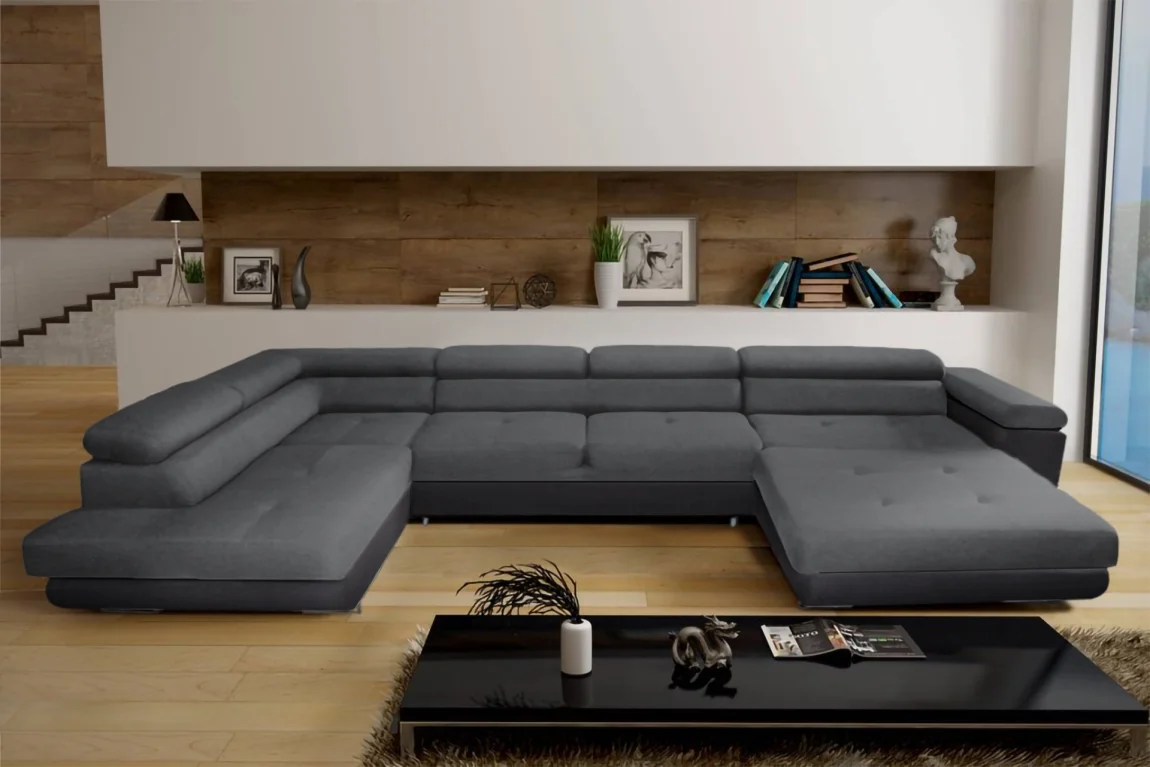 Toto je rohová sedačka ve tvaru U s orientací vlevo, navržená pro prostorný obývací pokoj a pohodlné sezení. K dispozici jsou dvě barevné varianty potahu Sawana: světle šedá Sawana 21 a tmavě šedá Sawana 05, které zvolíte podle stylu interiéru.