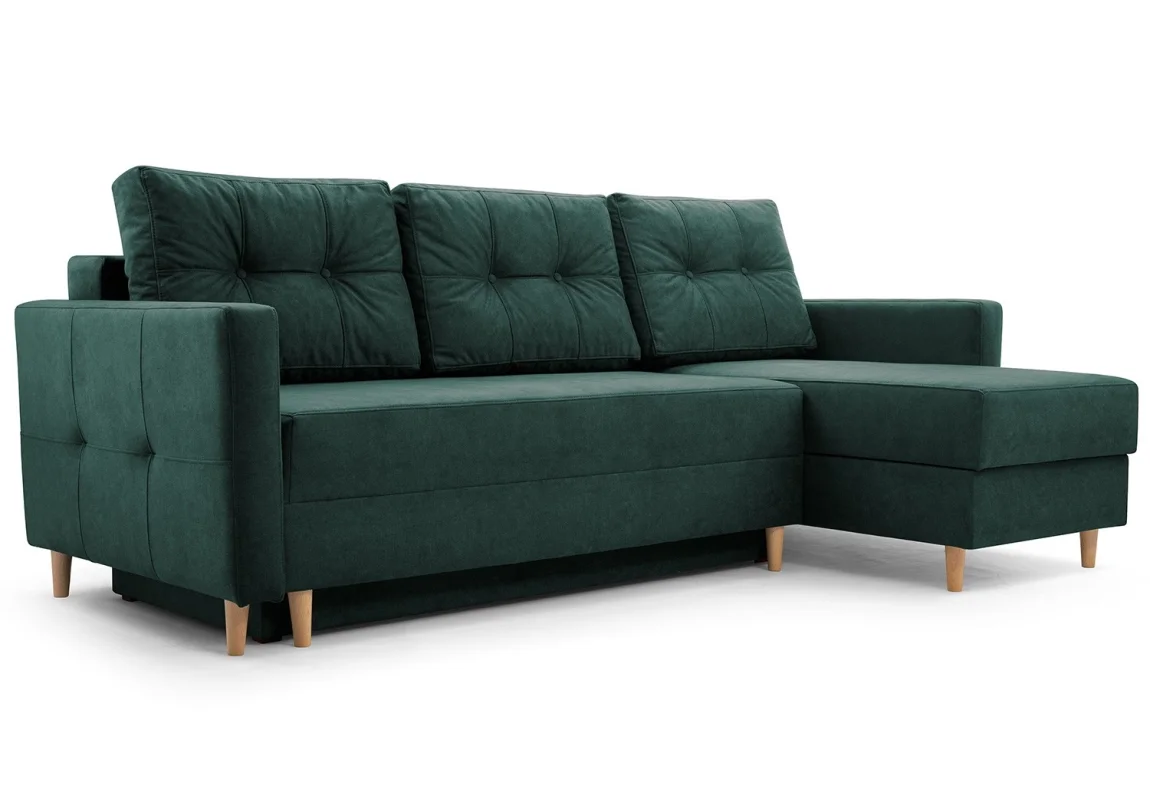 Elegantní rohová sedačka s rozkladem a úložným prostorem pro pravý roh. Rozměry: 233 cm na šířku, 96 cm na výšku a 146 cm na hloubku. Potah je v odstínu zelené látky Vena 4. Rám tvoří masivní dřevo a nábytkové desky; v sedácích jsou použity bonelové pružiny a vysoce elastická pěna T30 o tloušťce 3 cm. Mechanismus rozkladu DL umožňuje pohodlné a rychlé rozložení na spací plochu 209 x 140 cm. Záda sedačky jsou čalouněná, takže ji lze umístit i do prostoru bez nutnosti opěr. Detaily uvedené na fotografiích jsou ilustrační; k dispozici mohou být i jiné barvy a provedení. Sedačka dodávána v demontu.
