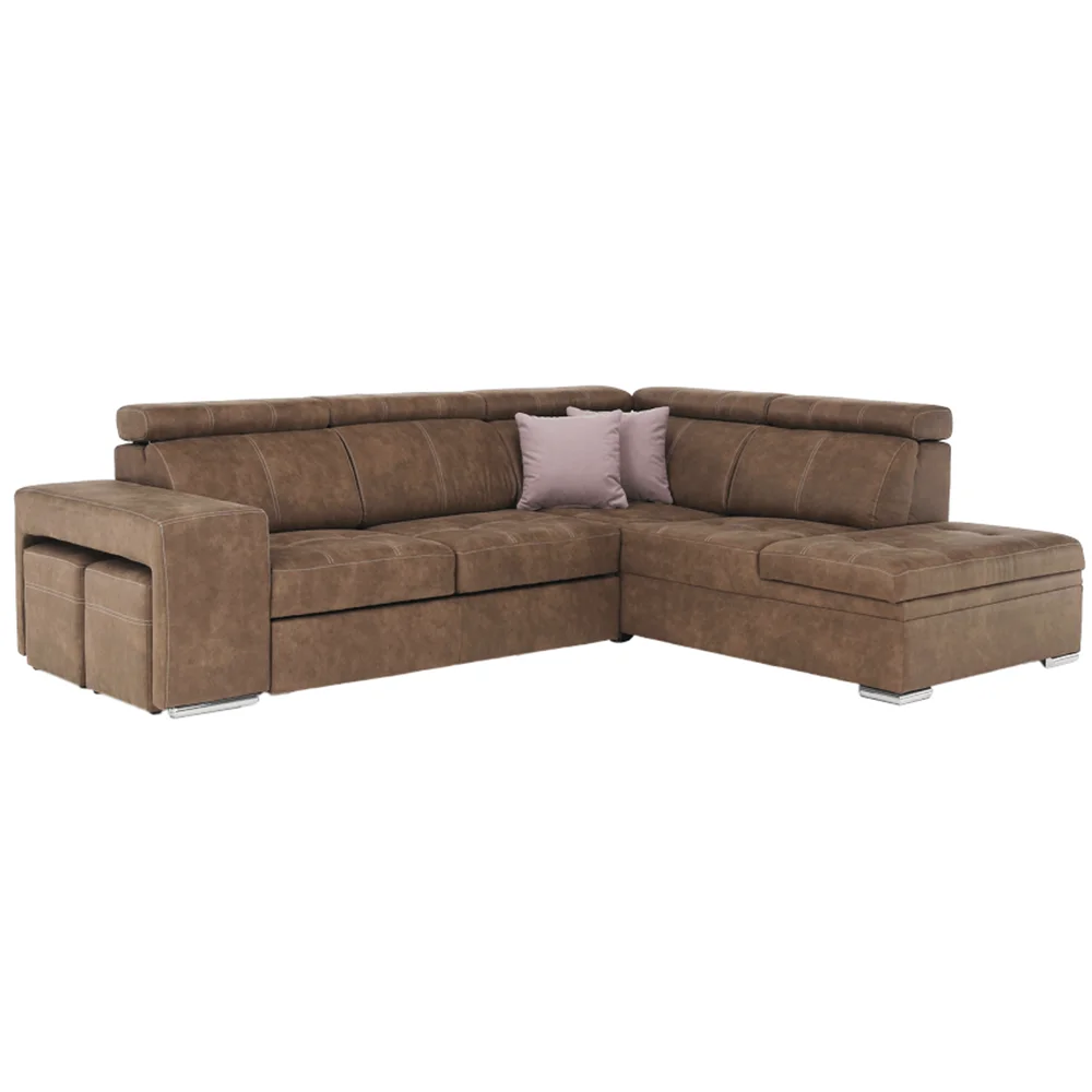 Celočalouněná rohová rozkládací sedačka s úložným prostorem a polohovacími záhlavami zajišťuje pohodlí při každodenním odpočinku. Materiál tvoří kombinace látky Preston a Jasmine, které nabízejí vysokou oděruodolnost – Preston až 68 000 Martindale a Jasmine až 90 000 Martindale. Sedačka je dodávána v pravém provedení a v barevných kombinacích hnědá a světle fialová. Rozměry (šířka x výška x hloubka): 275 x 220 x 85/100 cm; spaní plocha 120 x 190 cm. Výška spodního prostoru od podlahy je 5 cm, výška sedu 43 cm, hloubka sedu 53 cm. Součástí jsou polštáře a dva taburety; nosnost na osobu 90 kg; dodáváno v demontu. K dispozici jsou čtyři barvy látky Preston a čtyři barvy Jasmine a lze je kombinovat podle vašeho vkusu. Cena na individuální objednávku činí 39 790 Kč; 20% záloha je nutná pro zahájení výroby. Po uhrazení zálohy bude objednávka zadána do výroby a dodací doba je 6–8 týdnů. Navíc díky možnosti výběru potahů si snadno sladíte sedačku s vaším interiérem. Textilie Preston a Jasmine jsou navrženy pro dlouhou životnost a snadnou údržbu, což ocení rodiny i náročnější uživatelé.