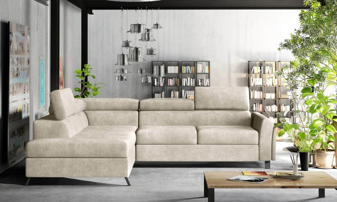 Rozkládací rohová sedačka s levým provedením kombinuje pohodlí s praktičností pro každodenní použití. Potahová látka Dora 21 v béžové barvě zajišťuje elegantní vzhled a snadnou údržbu.