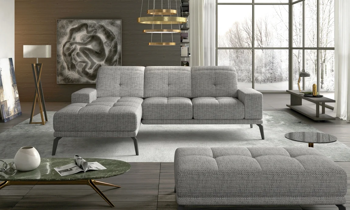 Rohová sedačka v provedení LEVÉ je potažena látkou Berlin 01 ve šedém odstínu a spojuje komfortní HR pěnu s jádrem T21/T25. Regulovatelné opěrky hlavy a zad umožňují ideální nastavení pro čtení, sledování televize i odpočinek a čalouněná záda zůstávají stejné látky pro jednotný vzhled.