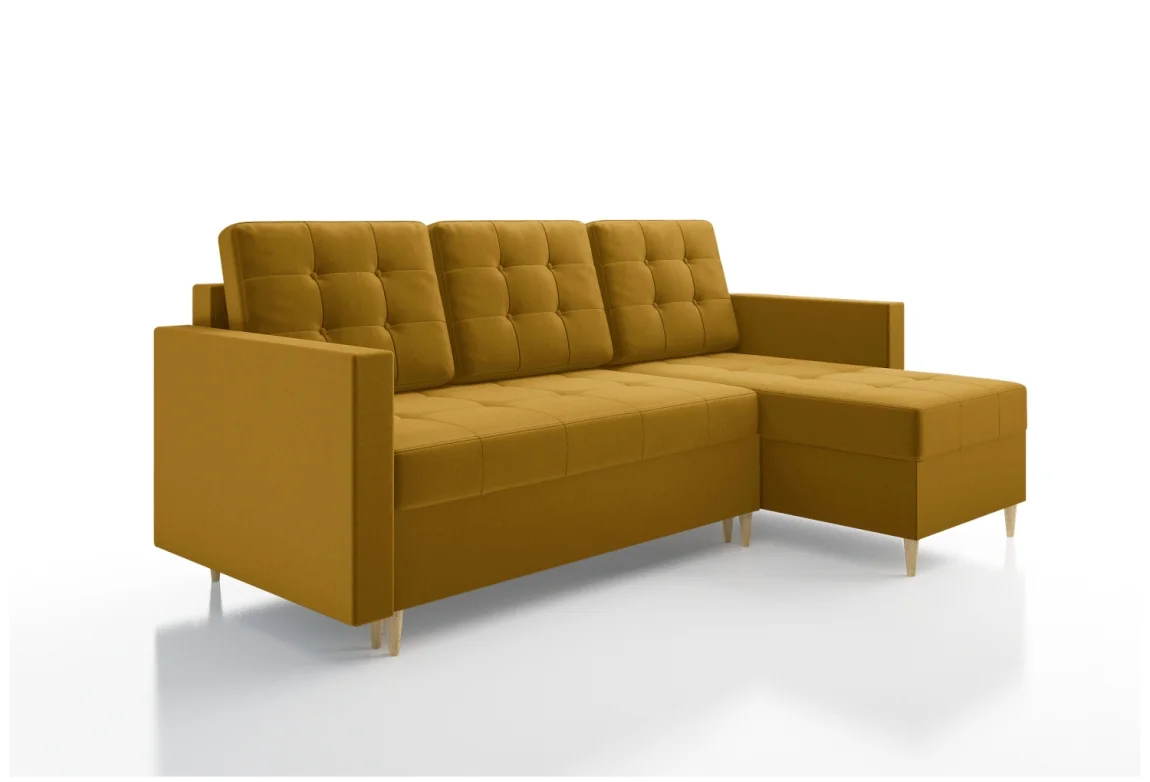 Rozkládací rohová sedačka MELANCANTA v hořčicové látce Mikado 08 přináší moderní vzhled a praktické využití do vašeho obývacího prostoru. Sedačka má prošívaný sedák a čalouněné polštáře, které dodávají eleganci a pohodlí.