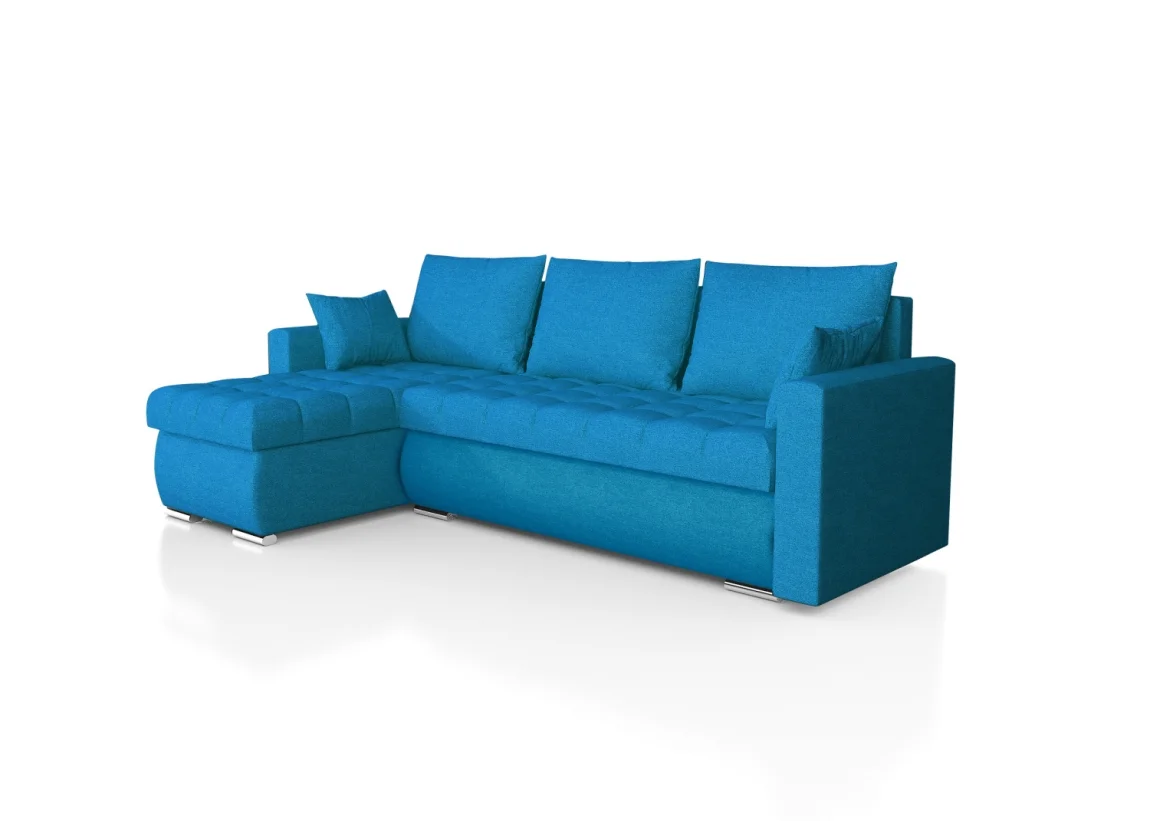 Rohová rozkládací sedačka MIRABILIS v modré látce Malmo 85 je praktickým doplňkem každého obývacího prostoru, který zvládne i nouzové spaní pro hosty. Její konstrukce vychází z nožek pochromovaných ve tvaru válce a sedáku s bonellovými pružinami pro dlouhou životnost a pohodlí.
