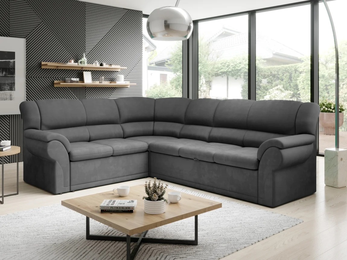 Rohová sedačka MUSTELIN s levým provedením představuje praktické rozkládací řešení pro moderní obývací pokoj. Potahová látka Monolith 97 v šedém odstínu dodává čistý vzhled a snadnou údržbu.