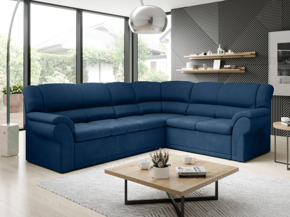 Rohová rozkládací sedačka MUSTELIN s pravým provedením je potažena tmavě modrou látkou Monolith 77, která vypadá elegantně a je snadná na údržbu. Konstrukce kombinuje vlnité pružiny a polyuretanovou pěnu T30 pro stabilní oporu a pohodlné sezení.