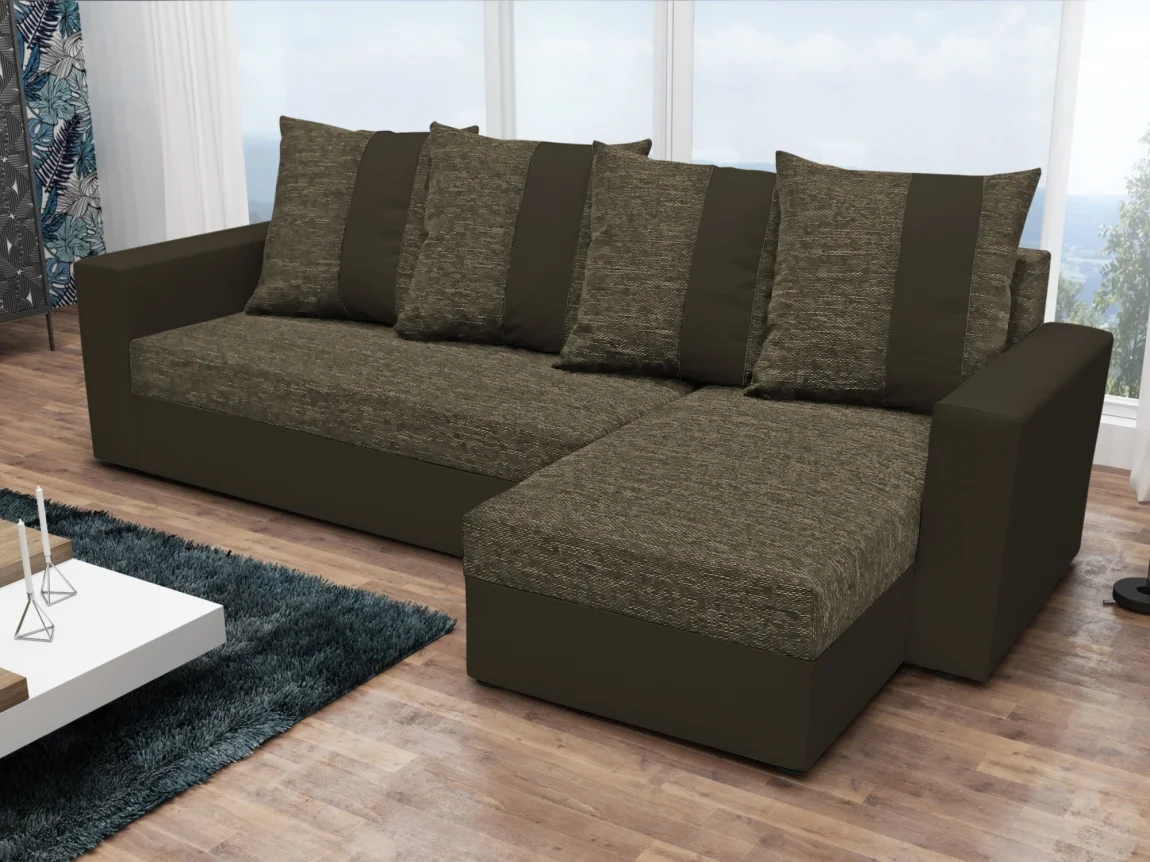 Univerzální rohová sedačka NOGAL se dodává s variantou potahu v hnědé látce Kornet 12 nebo hnědé ekokůži D33 a lze ji montovat s rohem na pravou i levou stranu pro lepší uspořádání prostoru. Zadní část sedačky je potažena látkou, díky čemuž ji lze postavit téměř kdekoliv v místnosti bez ohledu na zdi. Rozměry činí 230 × 133 × 69 cm a výška sedu dosahuje 40 cm, pro pohodlí při posezení. Příležitostné spaní je komfortně řešeno plochou 200 × 133 cm. Konstrukční materiály zahrnují lamino a smrkové dřevo s výplní z pěny T30 a vlnitých pružin, nohy jsou plastové. V balení najdete čtyři polštáře na zip a sedačka disponuje jedním úložným prostorem. Záruka 24 měsíců.