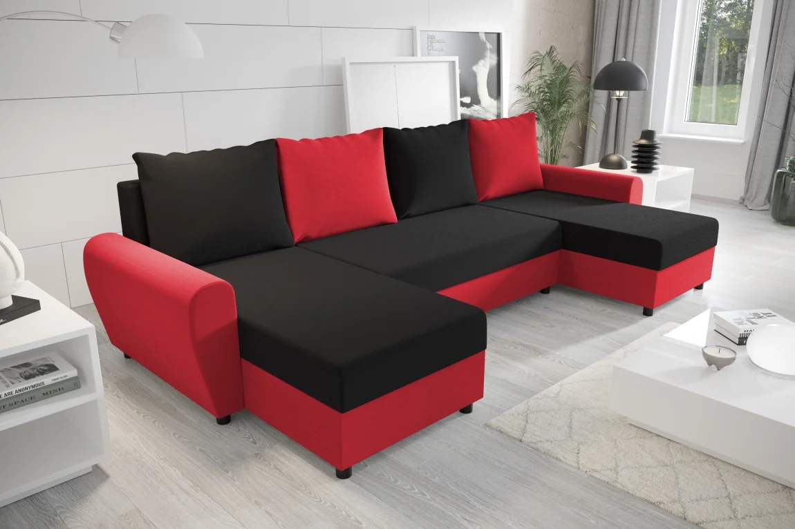 Rozkládací rohová sedačka do tvaru U kombinuje praktický úložný prostor s komfortním posezením a moderním designem. K dispozici jsou potahy Rainbow ve dvou variantách: Rainbow 15 (černá) a Rainbow 22 (červená).