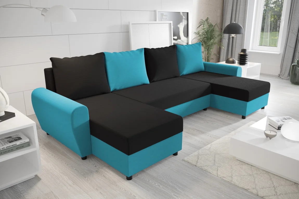 Rozkládací rohová sedačka ve tvaru U PERKSUM U kombinuje moderní design s praktickou funkcí, která se hodí do každého obýváku. Potahová látka je k dispozici ve dvou barevných variantách: Rainbow 15 černá a Rainbow 18 modrá.