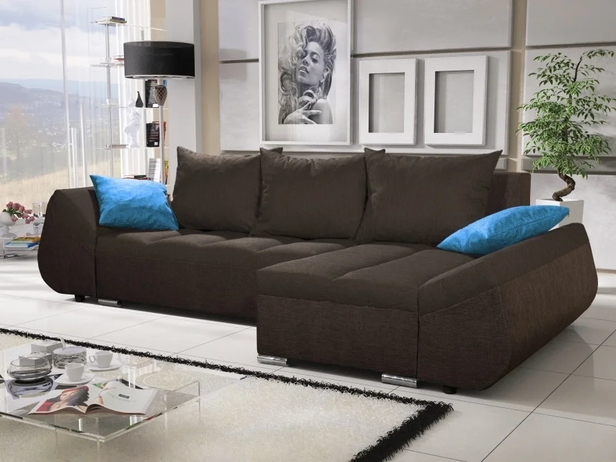 Zadní část sedačky je čalouněná látkou, což umožňuje její volné umístění v prostoru bez nutnosti opory ze zdi. Pevný masivní rám spolu s prvky dřevotřísky zajišťuje dlouhou životnost, zatímco vlnité pružiny a vysoce elastická pěna poskytují optimální oporu při sezení i spaní. Sedačka je univerzální – roh lze montovat jak na pravou, tak na levou stranu. Rozměry jsou 270 × 135 × 67 cm (výška včetně polštářů), výška sedu 39 cm a po rozložení nabízí spací plochu 200 × 135 cm. V ceně je i úložný prostor a dodání probíhá v demontu. Záruka na produkt činí 24 měsíců.