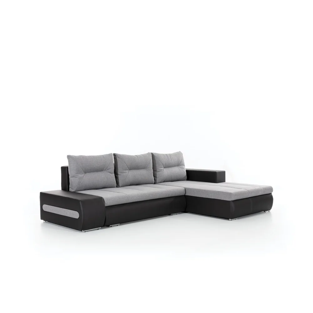 Po rozložení vzniká dodatečný úložný prostor pro lůžkoviny. Sedačka je čalouněná po celém povrchu, což dodává jednotný vzhled a hodí se do většího prostoru. Potah kombinuje světle šedou látku Sawana 21 a černou ekokůži Soft 11, čímž vzniká atraktivní kontrast a vyšší odolnost materiálů. Konstrukční zajištění tvoří vlnité pružiny a pěny T30 a T25; nohy z chromované oceli s plastovými prvky doplňují stabilitu a moderní vzhled. Rozměry: šířka 275 cm, hloubka 180 cm, výška 70/85 cm (bez/ se polštáři). Sedací výška 40 cm, hloubka sedu 58 cm. Prostor na spaní má rozměr 195 x 135 cm. Dodáváno v demontu; balíky 180 x 100 x 100 cm a 150 x 100 x 70 cm.