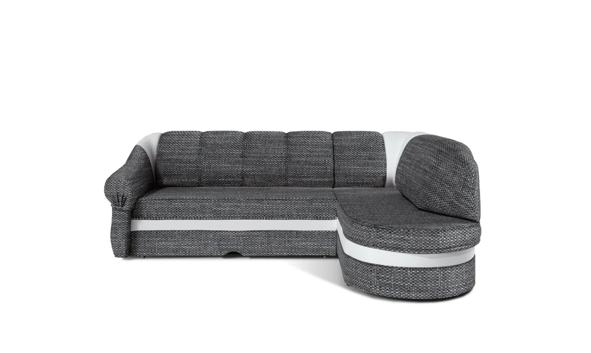 Rohová sedačka TONIL ve tvaru písmene L je dodávána s pravým provedením pro pohodlné sezení. K dispozici jsou dvě potahové varianty: Berlin 01 – šedá látka s jemným prošitím béžovou a černou nití a Soft 17 – bílá ekokůže.