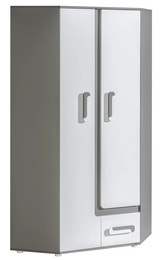 Rohová šatní skříň ORAKI II kombinuje antracitový korpus s bíle matnými dveřmi, což dodává interiéru moderní a svěží vzhled. Skříň patří do sektorové řady a vyznačuje se originálním zpracováním barev i výraznými úchyty.