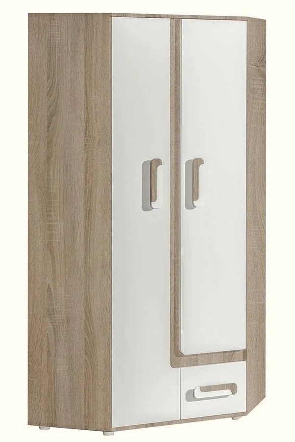 Rohová skříň z řady ORAKI II kombinuje svěží dub jasný s bílými matnými dveřmi. Tato rohová šatní skříň patří do sektorového systému a zaujme netradičním zpracováním barev a originálními úchyty, které osloví mladší generaci.