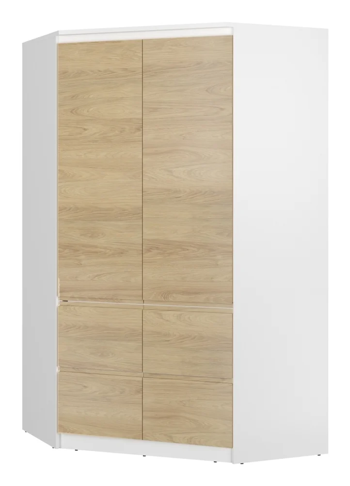Rohová skříň ZAIRE 4D v kombinaci alpské bílé a dubu hikora má moderní vzhled, který se hodí do každého interiéru. Lamino a MDF zajišťují pevnost a snadnou údržbu povrchů. Rozměry 120,9 x 213 x 120,9 cm poskytují dostatek prostoru pro šatní věci i doplňky. Dodáváno v demontu, montáž je ale rychlá a bez komplikací. Díky praktickému rohovému uspořádání šetří místo a umožňuje efektivní organizaci prostoru.