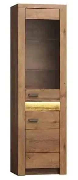 Rohová vitrína z kolekce INDIANAPOLIS nabízí praktické řešení pro obývací pokoj či jídelnu. Uprostřed se nachází zásuvka, v horní polovině je prosklená vitrína se dvěma poličkami a dole skříňka s jednou poličkou.