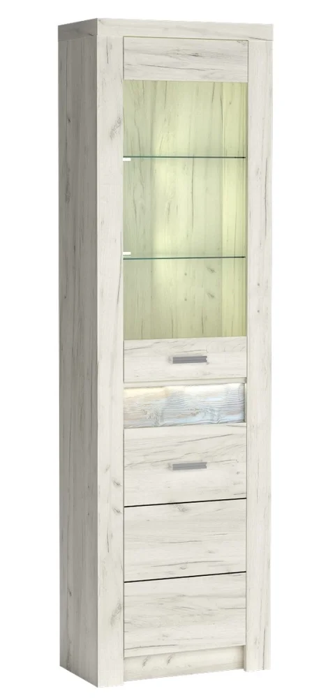 Celá řada vyniká jednoduchým tvarem a elegancí, které zajistí efektivní využití prostoru. LED osvětlení zasazené do ozdobné rýhované lišty lze dokoupit v naší nabídce a dodá tak dekorativní světlo, které zvýrazní rustikální vzhled dřevěného dekoru. Díky svým rozměrům a praktickému rozložení se vitrína hodí do různých prostor a poskytuje výrazné úložné i prezentační možnosti. Rozměry (š x v x h): 56 x 192 x 47 cm. Barva: jasan bílý. Materiál: LTD (lamino) s ABS hranami 0,5–0,8 mm a sklo. Úchyty: kov. Dodáváno v demontu.