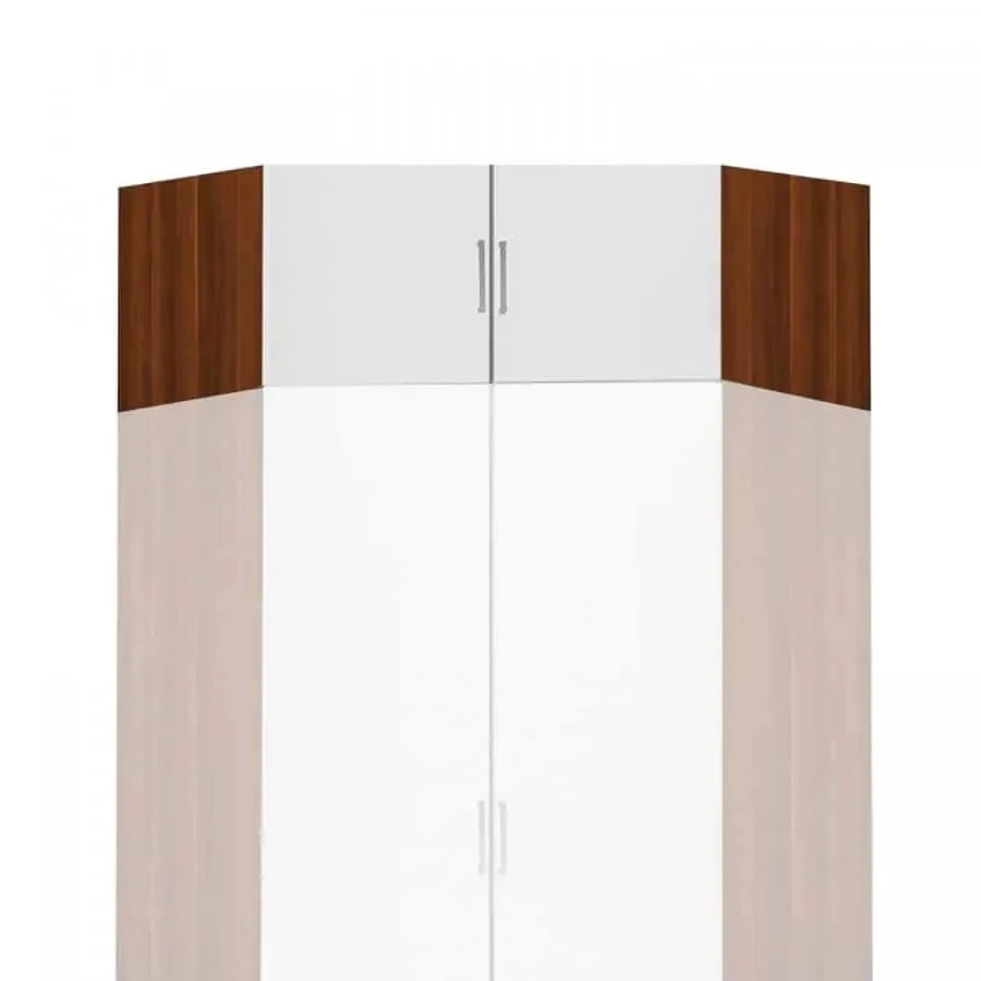 Rohový nástavec ESO 61555 v provedení ořech/bílá je vyroben z laminované dřevotřísky, která zajišťuje pevnou a odolnou konstrukci pro každodenní používání. Nástavec je určen pro skříň 61550 a dodává se v demontu, což usnadňuje přepravu i samotnou montáž. Kombinace teplého ořechového dekoru s bílou barvou působí moderne a hodí se do široké škály interiérů. Instalace je jednoduchá a spoje jsou navrženy tak, aby zajistily stabilní výsledek. Tento rohový doplněk efektivně využije prostor v rohu a nabídne praktické řešení pro organizaci a vzhled vaší skříně.