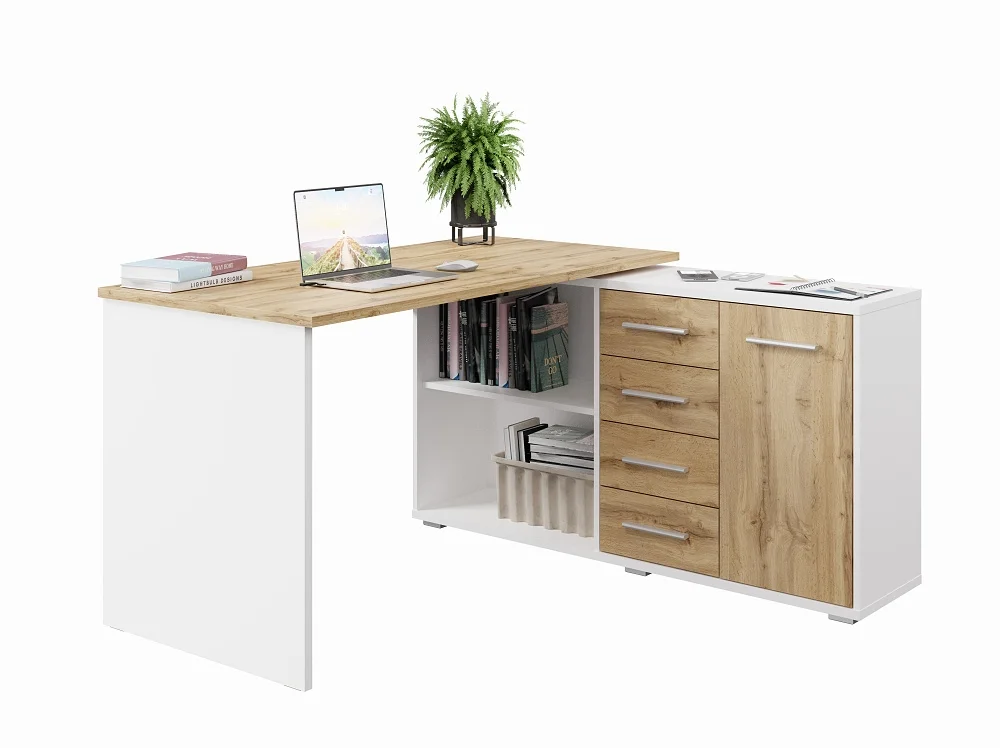 Rohový psací stůl Gianni v pravém provedení kombinuje moderní vzhled s praktickým uspořádáním pro domácí kancelář. Povrch ve spojení bílé barvy a dřevěného dekoru dub wotan působí lehce a svěže.