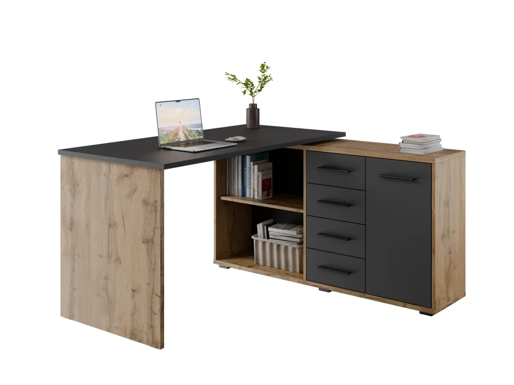 Rohový psací stůl Gianni v provedení pravý se vyznačuje kombinací dubu wotan a antracitu, která dodá vaší kanceláři moderní vzhled. Rozměry 138 cm šířky, 73,7 cm výšky a 135,4 cm hloubky poskytují dostatek místa pro dokumenty i techniku.