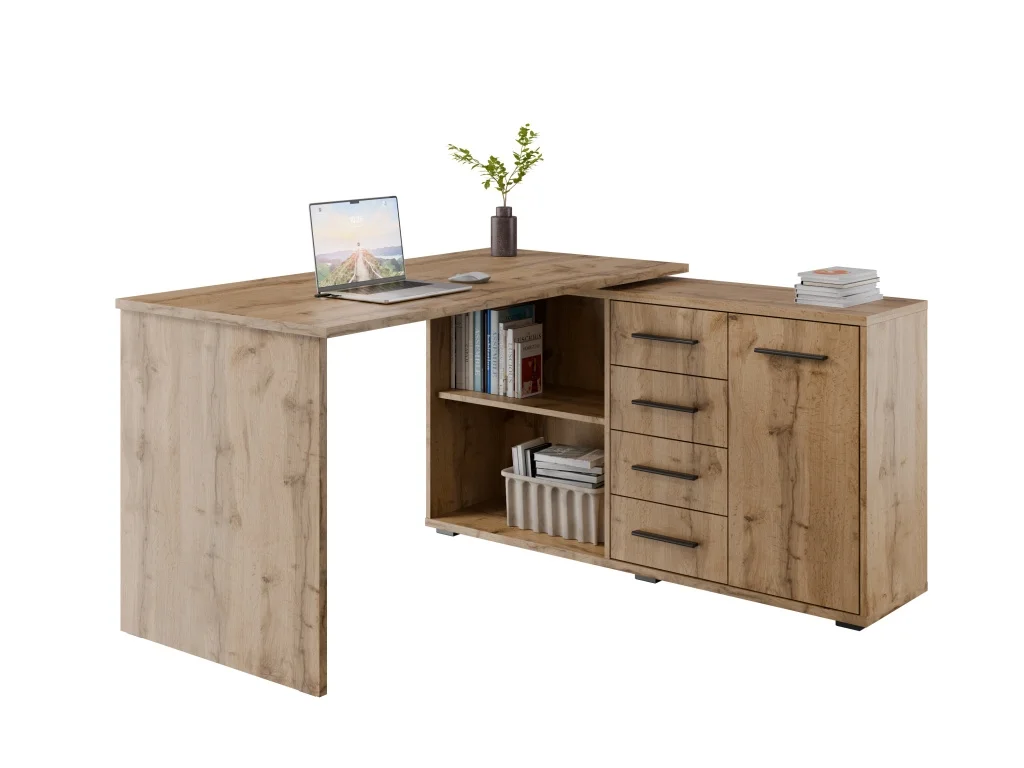 Rohový psací stůl NEJBY GIANNI v provedení pro pravý roh v odstínu dub wotan nabízí praktické a elegantní řešení pro vaši kancelář. Deska je vyrobena z laminované desky s tloušťkou 16–22 mm, což zajišťuje stabilní a odolnou pracovní plochu.