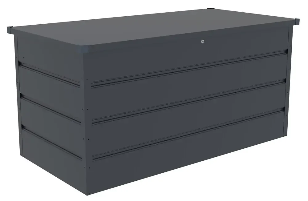 Vnitřní rozměry 174x77x80 cm nabízejí dostatek prostoru pro nářadí, polstry, hračky i další věci, které chcete mít po ruce, a to ve suchu a bez rizika poškození. Dva plynové písty usnadňují otevírání a zavírání víka a zabudovaný zámek chrání obsah. Tmavě šedý odstín dodává moderní vzhled, který zapadne do každé zahrady, terasy i balkonu. Objem 1 072 l a odolný kovový materiál dělají z tohoto boxu spolehlivé a esteticky atraktivní řešení pro skladování. Dodáváno v demontu.
