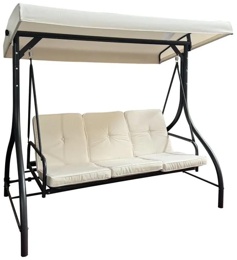 Stylová zahradní houpačka Paris kombinuje elegantní design s pohodlím díky pevné kovové konstrukci, která zaručuje stabilitu a dlouhou životnost. Umožňuje rozložení do polohy ležení pro ještě pohodlnější odpočinek a relaxaci na čerstvém vzduchu. Součástí jsou polštáře z voděodolného polyesteru 160 g, jejichž potahy jsou uloženy na rámu, a výplň tvoří 8 cm polyesterové vaty; stříška ze 180 g voděodolného polyesteru poskytuje ochranu před sluncem. Houpačka pojme až 3 osoby a lze ji snadno rozložit na lůžko. Rozměry sedáku: šířka 150 cm, hloubka 53 cm, výška opěradla 55 cm a výška sedu 50 cm. Dodáváno v demontu.