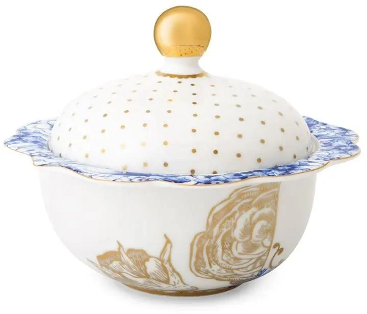 Elegantní porcelánová cukřenka z kolekce Royal White nabízí harmonické spojení jemných modrých dekorací s luxusními zlatými detaily. Její jedinečný tvar a tenkostěnný porcelán dodají vaší jídelní soupravě nádech sofistikovanosti.