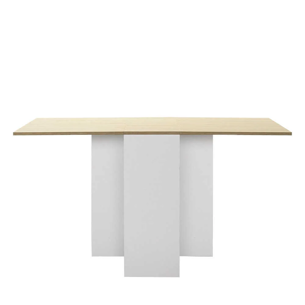 Praktický rozkládací jídelní stůl v kombinaci odstínu dubu a bílé zaujme flexibilitou pro každodenní i slavnostní příležitosti. Rozměry zahrnují variabilní šířku 28–84–140 cm, výšku 75 cm a hloubku 77 cm.