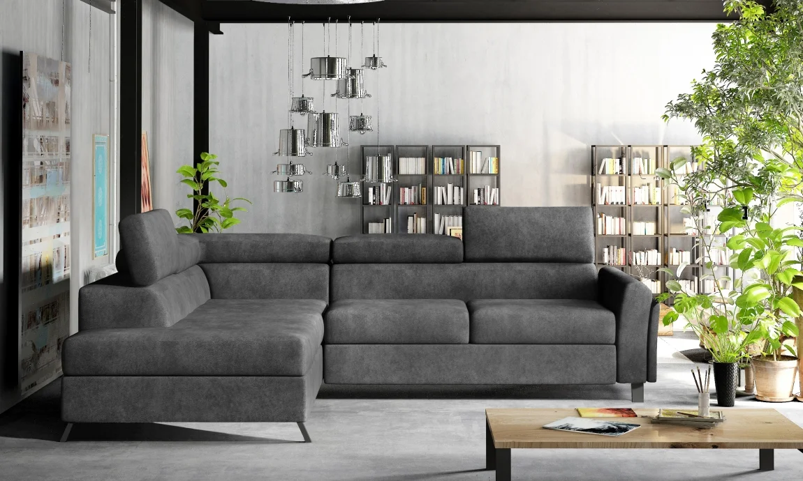 Rozkládací rohová sedačka s levým uspořádáním nabízí komfort i praktickou variabilitu pro každodenní použití. Potah Dora 95 v šedé barvě působí elegantně a je snadný na údržbu. Poznámka: ilustrační foto zobrazuje rozložený stav, skutečná barva může být jiná.