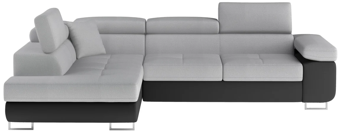 Rohová rozkládací sedačka MENDON 18 je dodána v levém provedení a kombinuje látku s černou ekokůží, což vytváří moderní kontrast. Zadní část je potažena látkou, takže ji lze umístit volně v prostoru bez nutnosti opírat o stěnu.