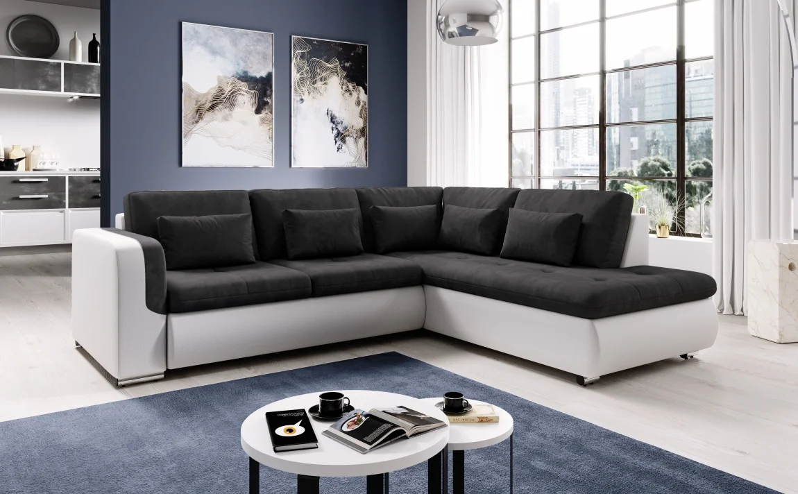 Rozkládací rohová sedačka PARDUS L je navržena pro pravý roh a nabízí pohodlné posezení i možnost pohodlného spaní po rozložení. Potah kombinuje černou látku Kronos 07 s bílou ekokůží Madryt 120 a opěrná část zad je stejně barevně a materiálově sladěna se sedákem, nikoli s ekokůží, jak ukazuje ilustrační obrázek.