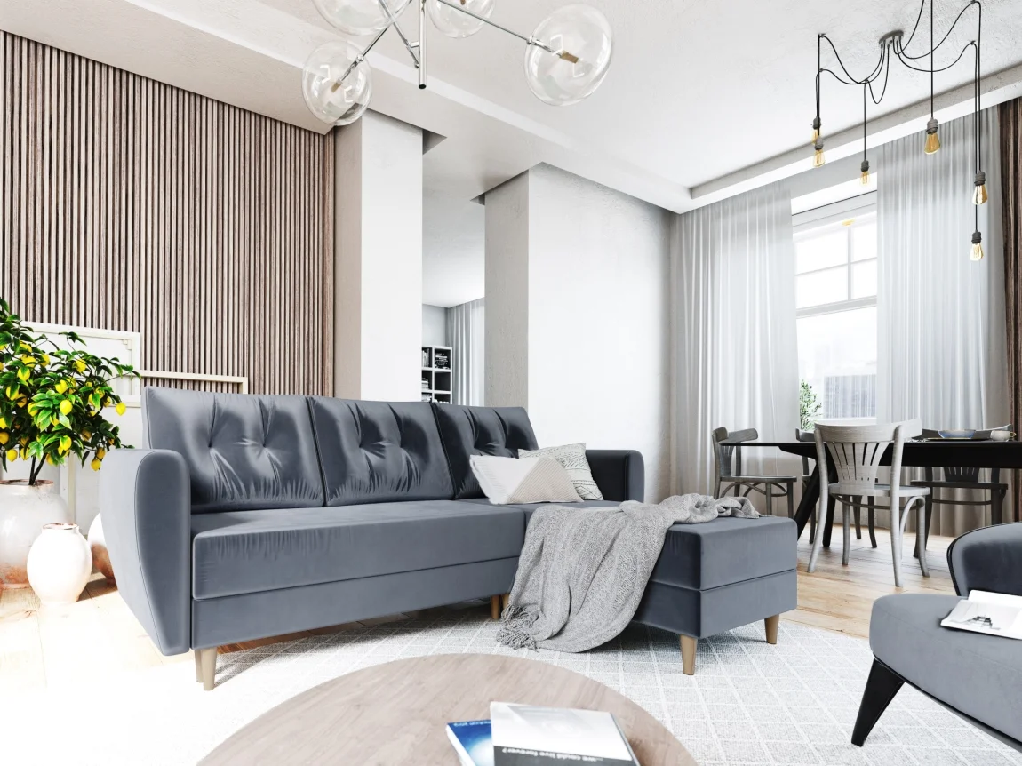 Rozkládací rohová sedačka SKYANG ve tvaru L nabízí flexibilní uspořádání prostoru; roh lze jednoduše otočit na pravý i levý směr podle dispozice místnosti. Potahová látka Itaka 50 v šedé barvě je voděodolná a snadno udržovatelná, tekutiny zůstávají na povrchu a nepronikají do vláken. Zadní část sedačky je potažena stejnou látkou, takže ji lze postavit i volně uprostřed prostoru. K konstrukci patří rám z dřevotřísky 19 mm a borovicové dřevo, doplněný PUR pěnou T30 a vlnitými pružinami; nohy jsou dřevěné vysoké 13 cm a při montáži se šroubují. Polštáře jsou vyplněny PU pěnou a uzavírají se zipem pro snadné praní povlaku. Rozměry: 226 × 145 × 85 cm; výška sedu 47 cm; výška polštářů 45 cm; výška sedačky bez polštářů 78 cm; boky 77 × 15 × 56 cm; prostor pro spaní 196 × 115 cm. Sedačka nabízí úložný prostor; dodání je v demontu a záruka činí 24 měsíců. Pro komfortnější vzhled a praktičnost doporučujeme doplnit ji o stylové polštáře a konferenční stolek, který podpoří interiér a funkčnost.