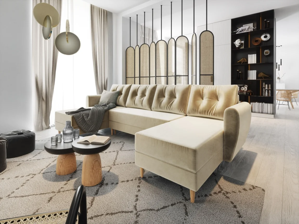 Rozkládací rohová sedačka ve tvaru U nabízí pohodlné spaní pro hosty a praktický úložný prostor. Látka Itaka 16 v béžové barvě je voděodolná a snadno se čistí; kapaliny zůstanou na povrchu a nevstřebávají se do vláken.