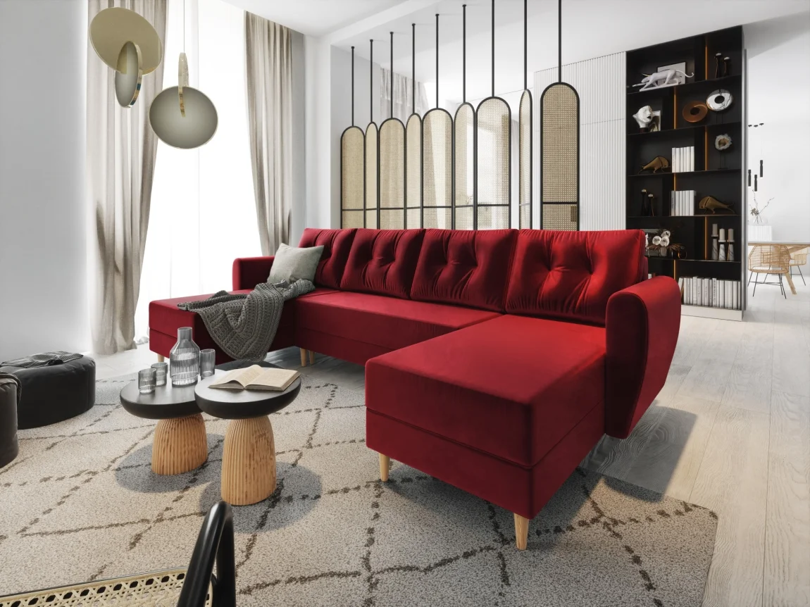 Rozkládací rohová sedačka SKYANG ve tvaru U s potahem Itaka 34 v červené barvě. Potah má voděodolnou úpravu, která zabraňuje prorůstání nečistot a usnadňuje čištění; tekutiny zůstávají na povrchu a dají se snadno setřít.