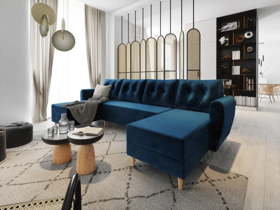 Tato rozkládací rohová sedačka do tvaru U spojuje komfort s praktičností pro prostory různých velikostí. Potahová látka Itaka 11 v modré barvě je voděodolná a znečistoty zůstávají na povrchu, což usnadňuje údržbu.