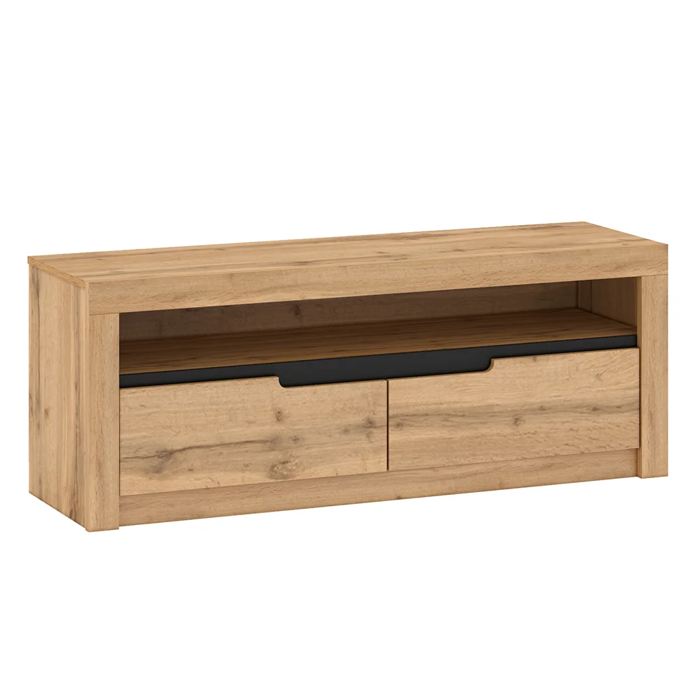 Elegantní RTV stolek B nabízí praktické řešení pro televizi a multimediální zařízení. Je vyroben z DTD laminované desky a MDF fólie, povrch v odstínu dub Wotan působí moderne a nadčasově. Rozměry 132,8 × 39,7 × 50,3 cm zajišťují stabilní základ a dostatek prostoru pro TV, set-top box a další doplňky. Tloušťka korpusu 16 mm zaručuje pevnost a dlouhou výdrž. Stolek má dva šuplíky a otevřený úložný prostor pro ovladače, kabely a další drobnosti. Dodání v demontu usnadňuje dopravu i montáž.